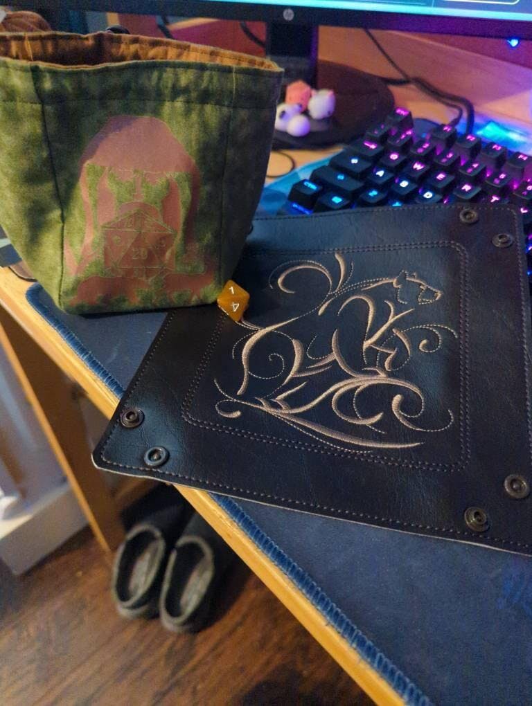 This dice tray is so beautiful! Got it for a birthday gift to my friend who’s a zookeeper. The embroidery is well done and it snaps together very nice without creasing the leather too bad. Seller was very sweet and was great about updates when shipping got delayed due to USPS having issues. Would definitely recommend this shop to fellow DnD players