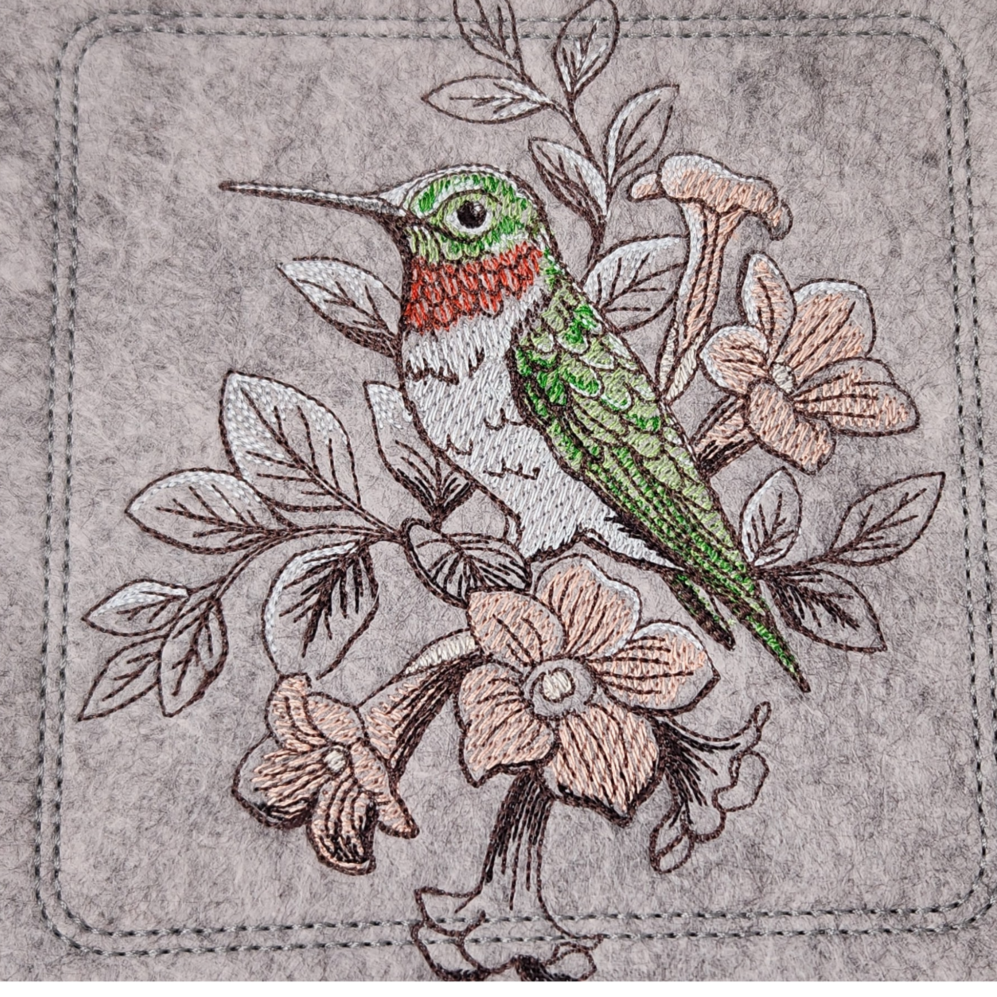 * Embroidered Hummingbird sitting among the tree blossoms.