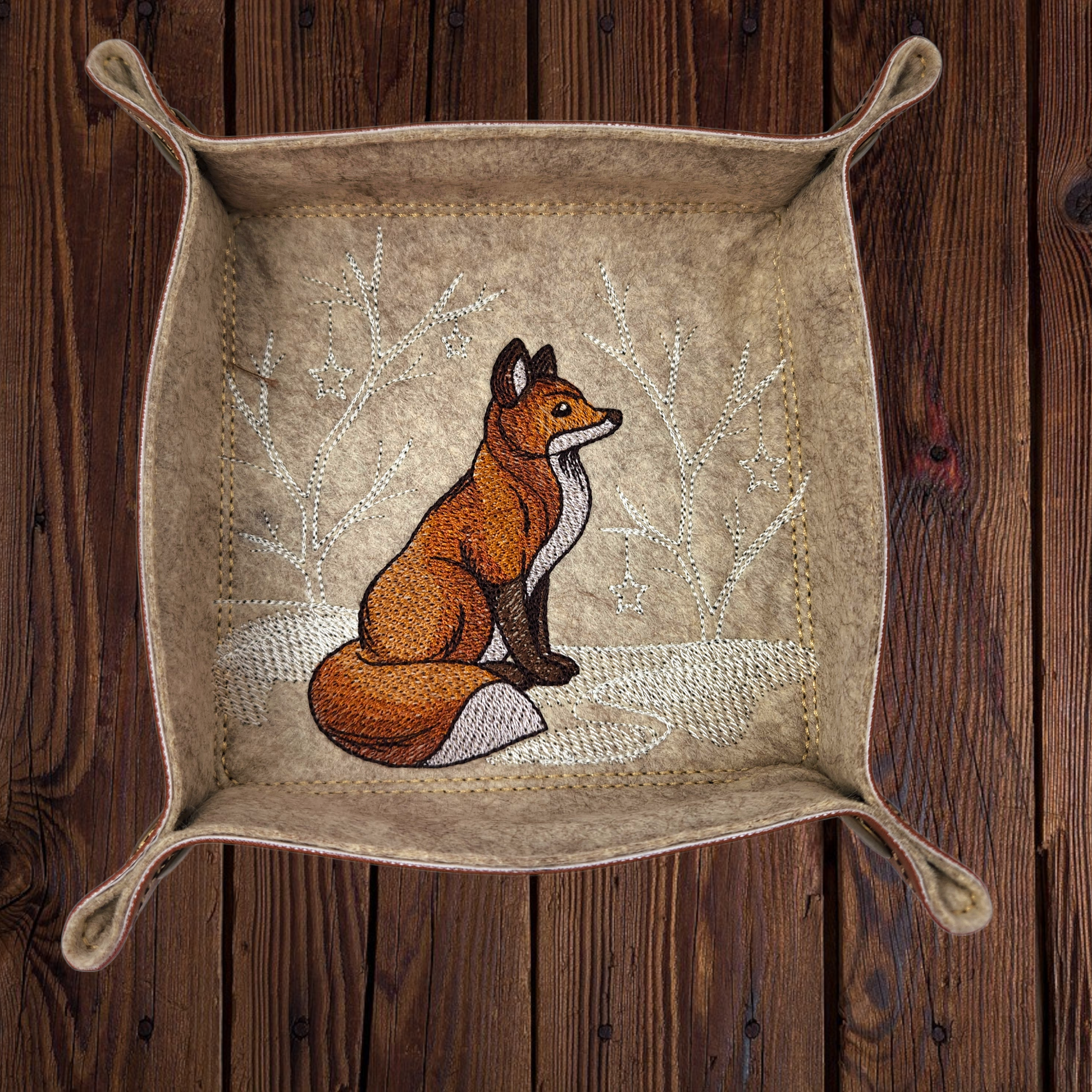 Meet your new favorite gaming companion! Our beautiful fox design dice tray brings a touch of whimsy to your tabletop adventures. With an embroidered fox nestled in a serene snowy scene, this tray not only keeps your dice in check but also adds charm to your gaming setup.