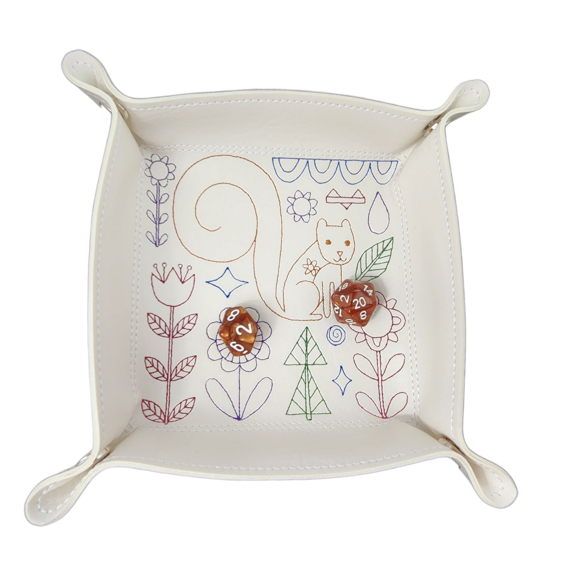 Crafted from durable off-white vinyl, this portable tray is perfect for gamers on the go. It measures a convenient 8” x 8” when laid flat and folds easily to fit snugly into a backpack or even your back pocket! Say goodbye to the days of dice rolling off the table; our tray keeps your dice organized and within reach.