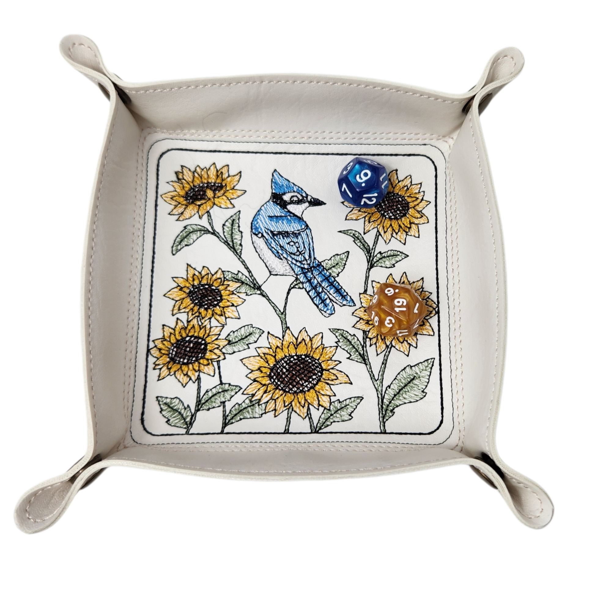 Are you ready to add a touch of beauty to your tabletop adventures? This stunning dice tray is not only a delightful accessory but also a practical solution for all your dice-rolling needs. With a charming Blue Jay resting in a Sunflower field embroidered design, it’s bound to make a statement at your next game session or board game night!