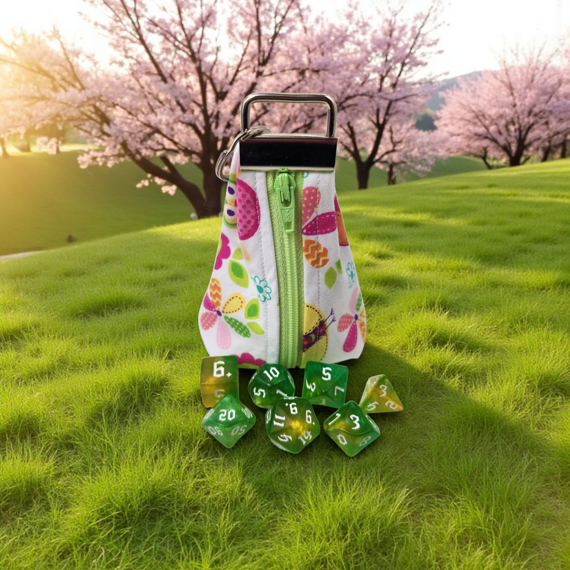 Never be without your dice! This compact zipper pouch is the perfect solution for gamers on the move. Sturdy cotton fabric, a no-fray fully lined interior, and a secure zipper keep your precious polyhedrals safe. It's perfectly sized at 5" from the top of the metal hoop by 3" wide to hold one or two standard 7-piece sets.