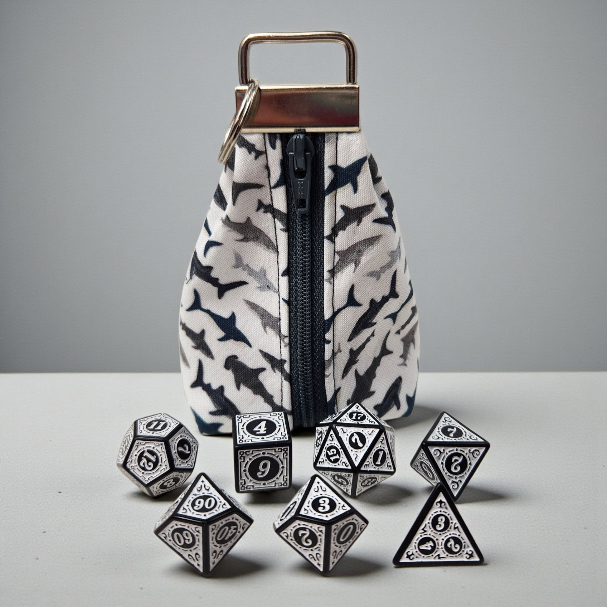 Never be without your dice! This compact zipper pouch is the perfect solution for gamers on the move. Sturdy cotton fabric, a no-fray fully lined interior, and a secure zipper keep your precious polyhedral safe. It's perfectly sized at 5" from the top of the metal hoop by 3" wide to hold one or two standard 7-piece sets.