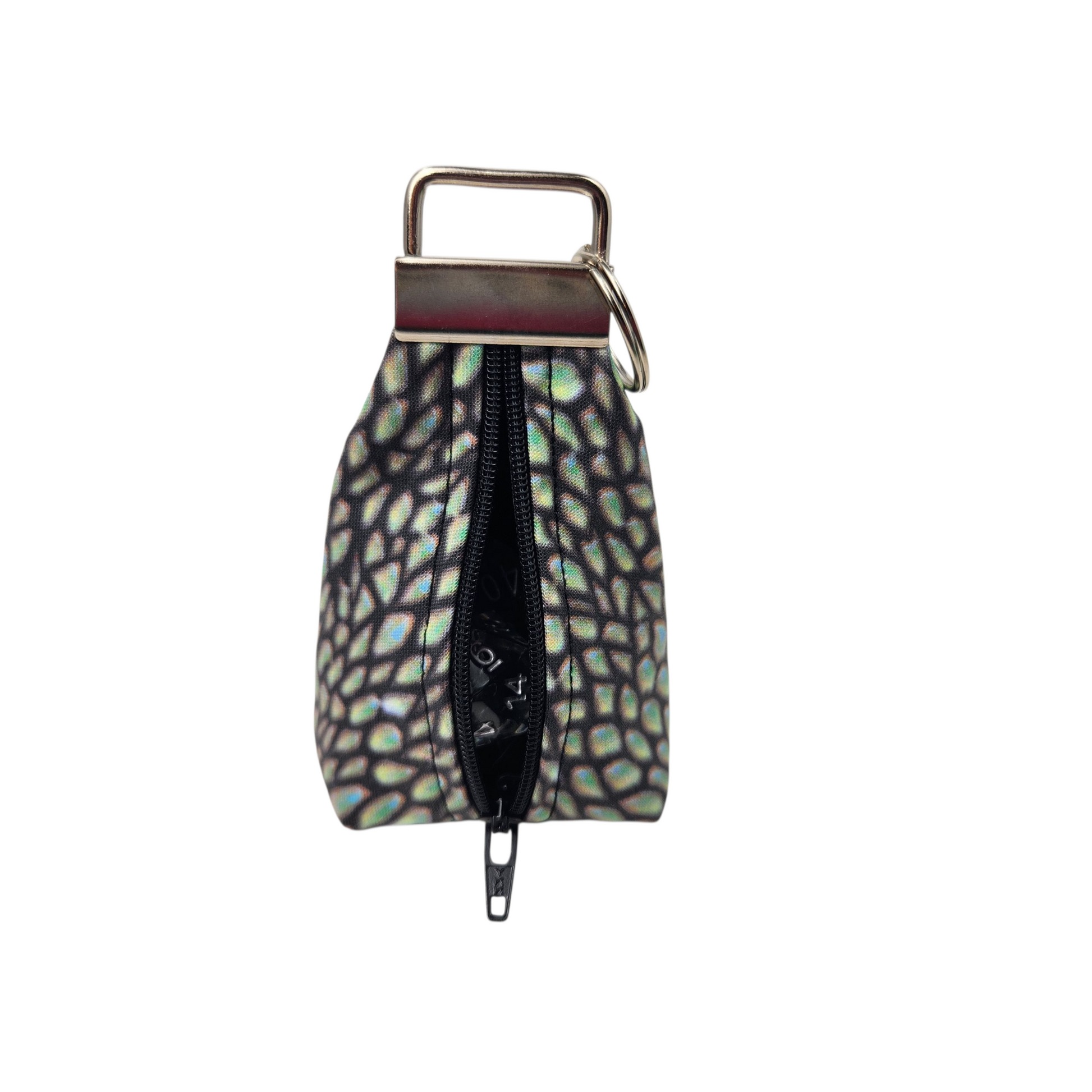 Embark on your next tabletop adventure with the Dragon Eye Grab and Go Dice Pouch! Crafted from eye-catching dragon scale fabric, this sleek pouch is designed for convenience and style. With a secure zipper and a handy key ring, you can easily attach it to your belt, backpack, or gear bag—making sure you're always ready for game night.