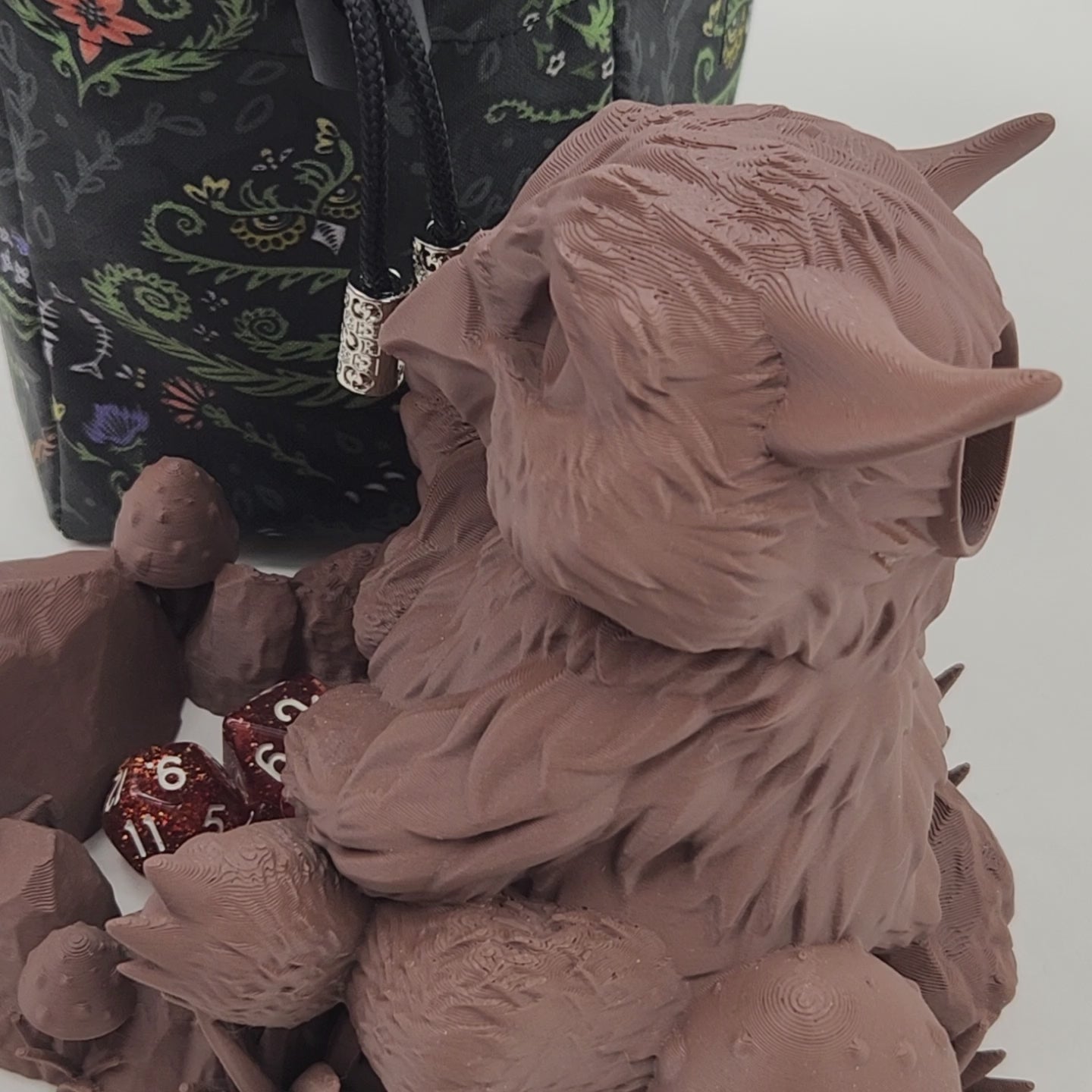 - **Owlbear Dice Tower:** This 3D printed masterpiece stands approximately 6" x 6" x 5" and is designed to cradle your standard-sized dice as they tumble down its whimsical exterior. The Owlbear theme adds a fantastical touch to your game nights!