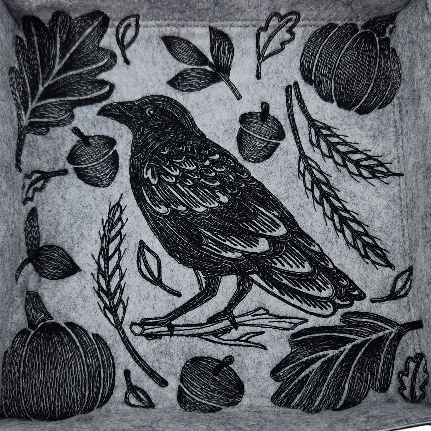 * Embroidered on the top layer is a stunning raven and fall design.